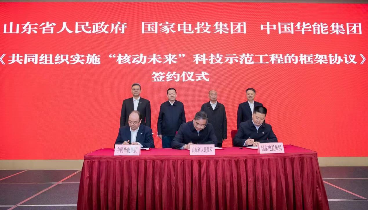 3月18日,山東省人民政府與國家電投集團(tuán)、中國華能集團(tuán)簽署《共同組織實(shí)施“核動未來”科技示范工程的框架協(xié)議》。山東省委書記林武,省委副書記、省長周乃翔,國家電投黨組書記、董事長錢智民,中國華能黨組書記、董事長溫樞剛出席簽約儀式。山東省委常委、副省長曾贊榮,國家電投黨組成員、副總經(jīng)理盧洪早,中國華能黨組成員、副總經(jīng)理張濤代表三方在協(xié)議上簽字。山東省委常委、秘書長張海波,副省長宋軍繼參加。