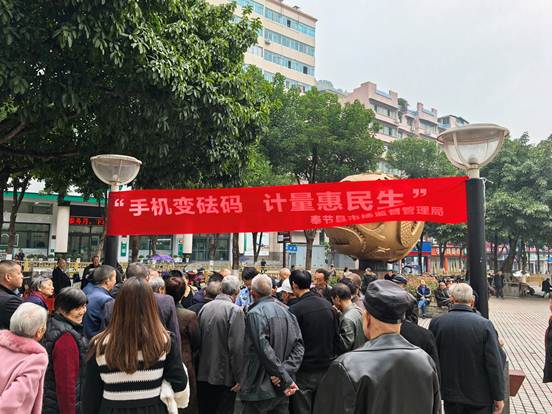 近日,為持續(xù)深入開展電子計(jì)價(jià)秤市場(chǎng)秩序整治行動(dòng),重慶市奉節(jié)縣市場(chǎng)監(jiān)管局在菜市場(chǎng)入口、廣場(chǎng)等人流量大的地方開展“手機(jī)變砝碼 計(jì)量惠民生”便民服務(wù)活動(dòng)。