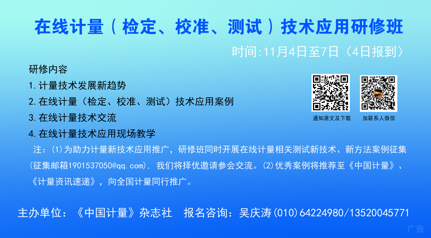 為推動(dòng)在線計(jì)量、智能計(jì)量等計(jì)量測(cè)試新技術(shù)、新方法的推廣與應(yīng)用,《中國(guó)計(jì)量》雜志擬于2025年11月初舉辦“2025在線計(jì)量(檢定、校準(zhǔn)、測(cè)試)技術(shù)應(yīng)用研修班”。此次研修班采取培訓(xùn)與交流研討相結(jié)合的方式進(jìn)行,擬邀請(qǐng)相關(guān)機(jī)構(gòu)、企業(yè)展示在線計(jì)量應(yīng)用案例,為計(jì)量檢測(cè)新技術(shù)、新方法搭建應(yīng)用展示平臺(tái),助力計(jì)量服務(wù)高質(zhì)量發(fā)展?,F(xiàn)將研修班有關(guān)事項(xiàng)通知如下: