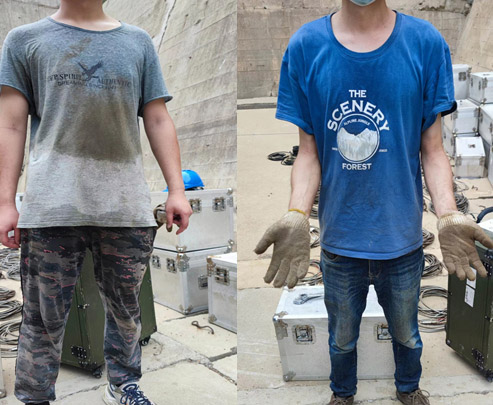 在炙熱的室外,太陽宛如火爐一般,分外熱情。只見兩個人的身影,他們正趴在地上一遍遍地檢驗著測試設備。汗水瞬間就打濕了他們的衣衫,他們的臉頰不停地流著汗水,模糊了雙眼,但是他們顧不得太多,用手擦擦汗水,繼續(xù)投入工作,因為他們深知手中的任務不能耽誤。一天換上了三件T恤,全部濕透,衣服都能擰出汗水。“這是我們有史以來,遇見最特殊的一次任務”。楊隊長如是說道。