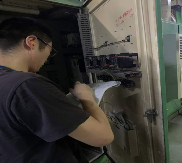 當(dāng)天,室溫高達(dá)40℃,需校準(zhǔn)的設(shè)備位于210℃的烘爐旁,現(xiàn)場溫度較高、環(huán)境嘈雜。鄂州分院計量人員頂著高溫,帶著耳塞,在烘爐配電柜里仔細(xì)對照配電圖,逐一對每臺設(shè)備進(jìn)行排查,邊校準(zhǔn)邊調(diào)整,不敢有一絲懈怠。雖然身上的衣服很快就被汗水浸透了,但他們?nèi)匀焕^續(xù)工作,絲毫沒有休息的打算。經(jīng)過幾個小時的不懈努力,分院計量人員最終排查出控溫不穩(wěn)定的兩臺設(shè)備,并告知企業(yè)及時進(jìn)行處理。