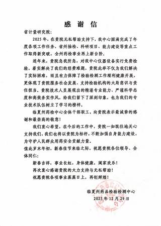 近日,甘肅省計量研究院(以下簡稱“我院”)收到一封來自臨夏州藥品檢驗檢測中心的感謝信。信中字里行間飽含真摯謝意,對我院在藥品檢驗檢測領(lǐng)域展現(xiàn)出的精湛專業(yè)能力、嚴謹科學(xué)態(tài)度和高效務(wù)實作風(fēng)給予高度評價,稱贊其以精準計量為臨夏州藥品質(zhì)量安全筑牢“技術(shù)防線”,為地方醫(yī)藥健康事業(yè)發(fā)展注入強勁動力。