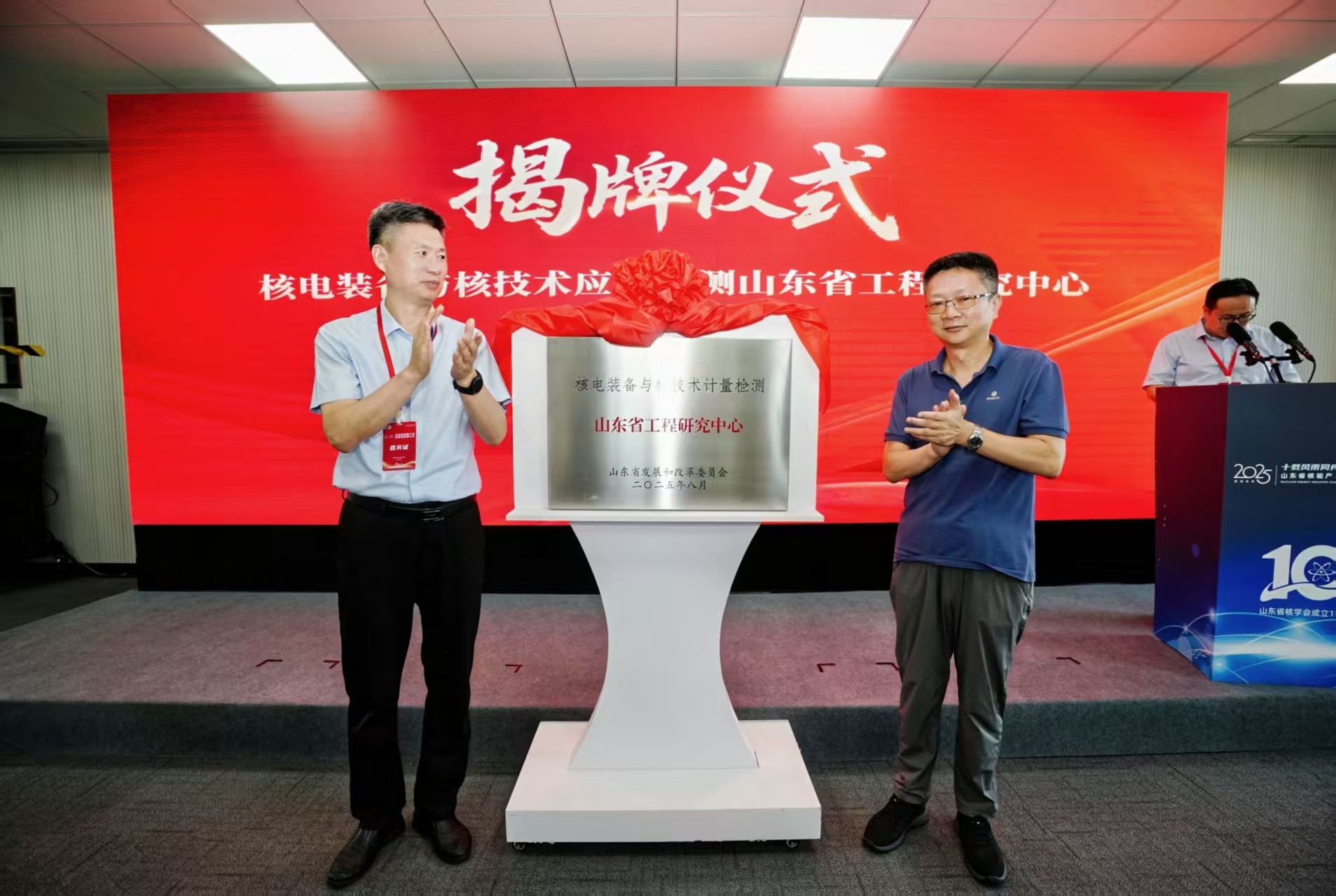 在揭牌儀式環(huán)節(jié),煙臺(tái)市標(biāo)準(zhǔn)計(jì)量檢驗(yàn)檢測(cè)中心紀(jì)委書(shū)記、山東省核學(xué)會(huì)標(biāo)準(zhǔn)化專委會(huì)主任委員曹慶新,與工學(xué)博士、哈爾濱工程大學(xué)教授、博士生導(dǎo)師彭敏俊共同為“核電裝備與核技術(shù)計(jì)量檢測(cè)山東省工程研究中心”揭牌。該工程研究中心由煙臺(tái)市標(biāo)準(zhǔn)計(jì)量檢驗(yàn)檢測(cè)中心、哈爾濱工程大學(xué)、煙臺(tái)哈爾濱工程大學(xué)研究院、中核第七研究設(shè)計(jì)院有限公司、煙臺(tái)恒邦泵業(yè)有限公司共同籌建,通過(guò)整合國(guó)家級(jí)平臺(tái)資源與產(chǎn)學(xué)研尖端力量,在科學(xué)研究、人才培養(yǎng)和技術(shù)服務(wù)等方面開(kāi)展緊密合作,持續(xù)提升核電裝備計(jì)量檢測(cè)核心競(jìng)爭(zhēng)力,為山東核能產(chǎn)業(yè)發(fā)展注入新的技術(shù)支撐。
