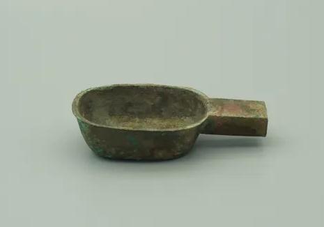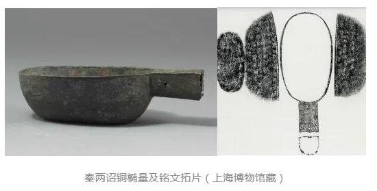 中國(guó)計(jì)量大學(xué)計(jì)量博物館館藏一件漢刻銘銅量(被吳鎮(zhèn)烽收錄于《商周青銅器銘文暨圖像集成三編》(第四卷),上海:上海古籍出版社,2020年,第334頁(yè)),國(guó)家三級(jí)文物??诔蕶E圓形,直口,口沿外撇,腹壁向下漸收,平底,一側(cè)有短柄,柄上平面,且與器口平齊,下部作弧形,柄下部銘文:“今一斤四兩”,內(nèi)底部有“□”符號(hào),柄內(nèi)有朽木痕跡,今實(shí)測(cè)重299.64克,通長(zhǎng)16cm,口長(zhǎng)11.1厘米,口寬7.9cm,高4.3cm,容194毫升,約合漢一升。該件銅量,為我們研究漢代量器及考訂量值提供了新的實(shí)物資料,還在一定程度上反映了漢代的政治、經(jīng)濟(jì)等方面情況。