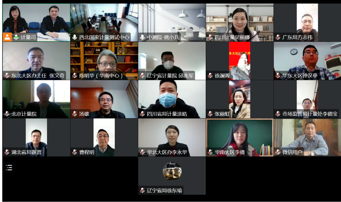 會(huì)議由總局計(jì)量司鄭華欣處長(zhǎng)主持,來(lái)自華北、東北、華東、中南、華南、西南、西北大區(qū)國(guó)家計(jì)量測(cè)試中心,北京、遼寧、上海、湖北、廣東、四川、陜西等省、直轄市市場(chǎng)監(jiān)管局,以及大區(qū)中心依托技術(shù)單位的代表共計(jì)27人參加會(huì)議。