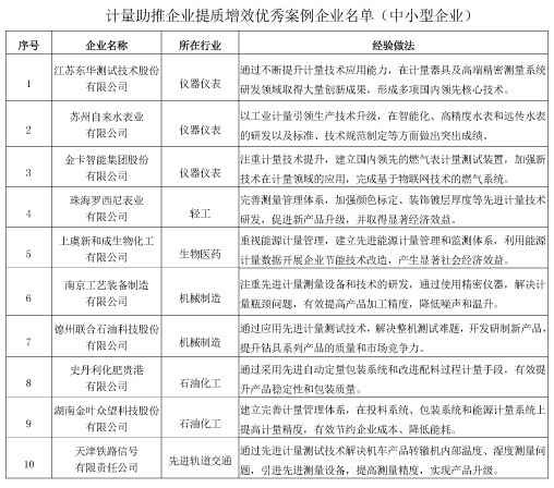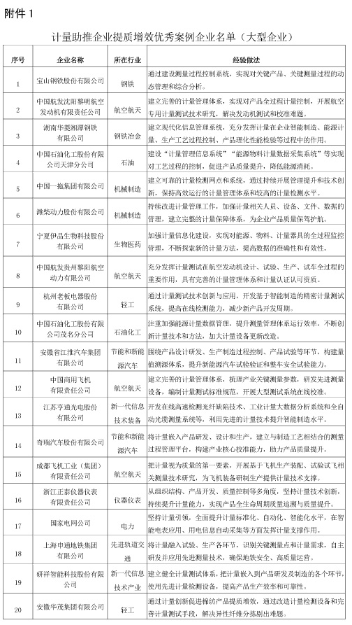 近日,市場(chǎng)監(jiān)管總局下發(fā)《市場(chǎng)監(jiān)管總局辦公廳關(guān)于宣傳推廣計(jì)量助推企業(yè)提質(zhì)增效典型案例的通知》,要求各地加大對(duì)企業(yè)計(jì)量工作典型做法和經(jīng)驗(yàn)案例的宣傳推廣,其中有20家大型企業(yè)和10家中小型企業(yè)“榜上有名”,作為優(yōu)秀案例被重點(diǎn)推介和宣傳。這些企業(yè)是: