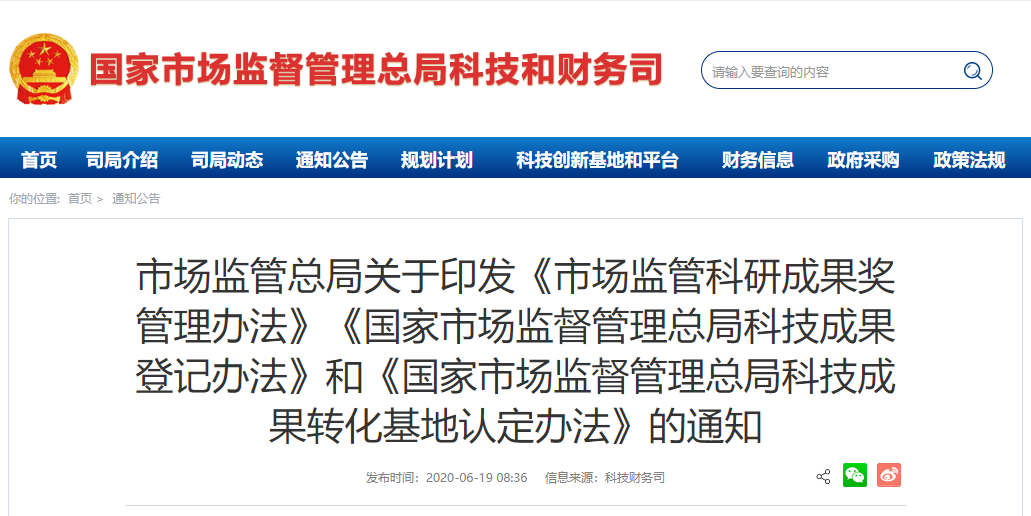 為建立和完善市場監(jiān)管科技創(chuàng)新管理制度,做好市場監(jiān)管科研成果獎(jiǎng)評(píng)選表彰、科技成果登記和科技成果轉(zhuǎn)化應(yīng)用,總局制定了《市場監(jiān)管科研成果獎(jiǎng)管理辦法》《國家市場監(jiān)督管理總局科技成果登記辦法》和《國家市場監(jiān)督管理總局科技成果轉(zhuǎn)化基地認(rèn)定辦法》,經(jīng)總局局務(wù)會(huì)審議通過,現(xiàn)予以印發(fā),請(qǐng)認(rèn)真貫徹執(zhí)行。