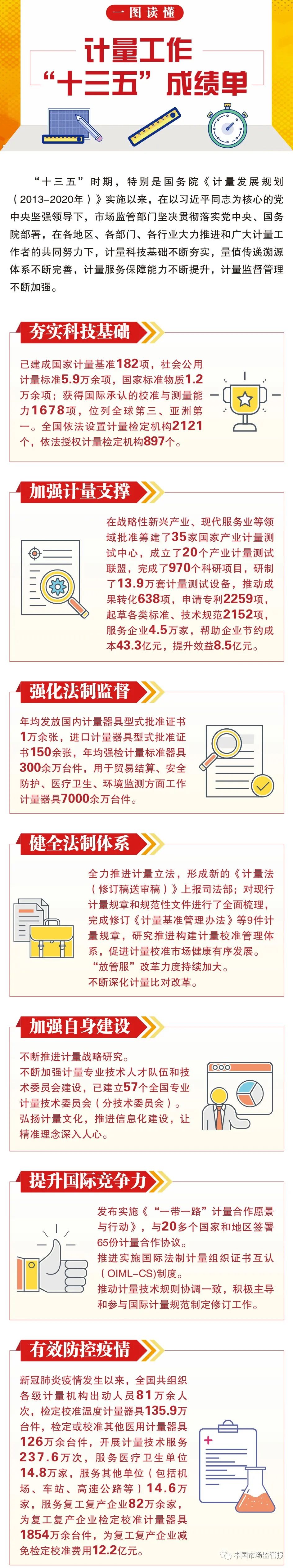 “十三五”時期,特別是國務(wù)院《計量發(fā)展規(guī)劃(2013-2020年)》實施以來,在以習(xí)近平同志為核心的黨中央堅強(qiáng)領(lǐng)導(dǎo)下,市場監(jiān)管部門堅決貫徹落實黨中央、國務(wù)院部署,在各地區(qū)、各部門、各行業(yè)大力推進(jìn)和廣大計量工作者的共同努力下,計量科技基礎(chǔ)不斷夯實,量值傳遞溯源體系不斷完善,計量服務(wù)保障能力不斷提升,計量監(jiān)督管理不斷加強(qiáng)。各級各部門奮力夯實高質(zhì)量發(fā)展的計量基礎(chǔ),共同推進(jìn)計量事業(yè)改革創(chuàng)新融合發(fā)展,計量工作取得了新成績,計量事業(yè)實現(xiàn)了新發(fā)展,在經(jīng)濟(jì)社會發(fā)展全局中發(fā)揮了重要作用,交出了一份有分量、重數(shù)量、高質(zhì)量,服務(wù)經(jīng)濟(jì)社會發(fā)展的計量答卷。